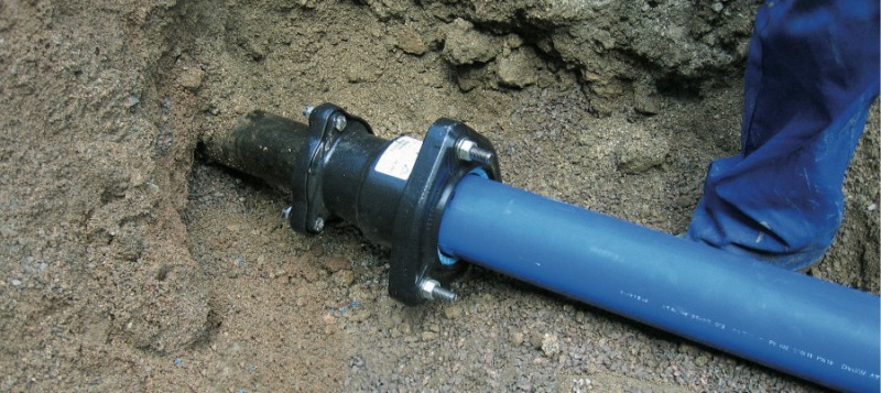 Project: In Germany, for daily repair and renewal of the existing pipe network, many utility companies us PE-HD pipe materials. For this project, in Memmingen, a FriaGrip (UltraGrip) stepped coupling, utilizes a stainless steel support liner to connect an old grey cast iron pipe sized DN80 to a new DN100 PE pipe.